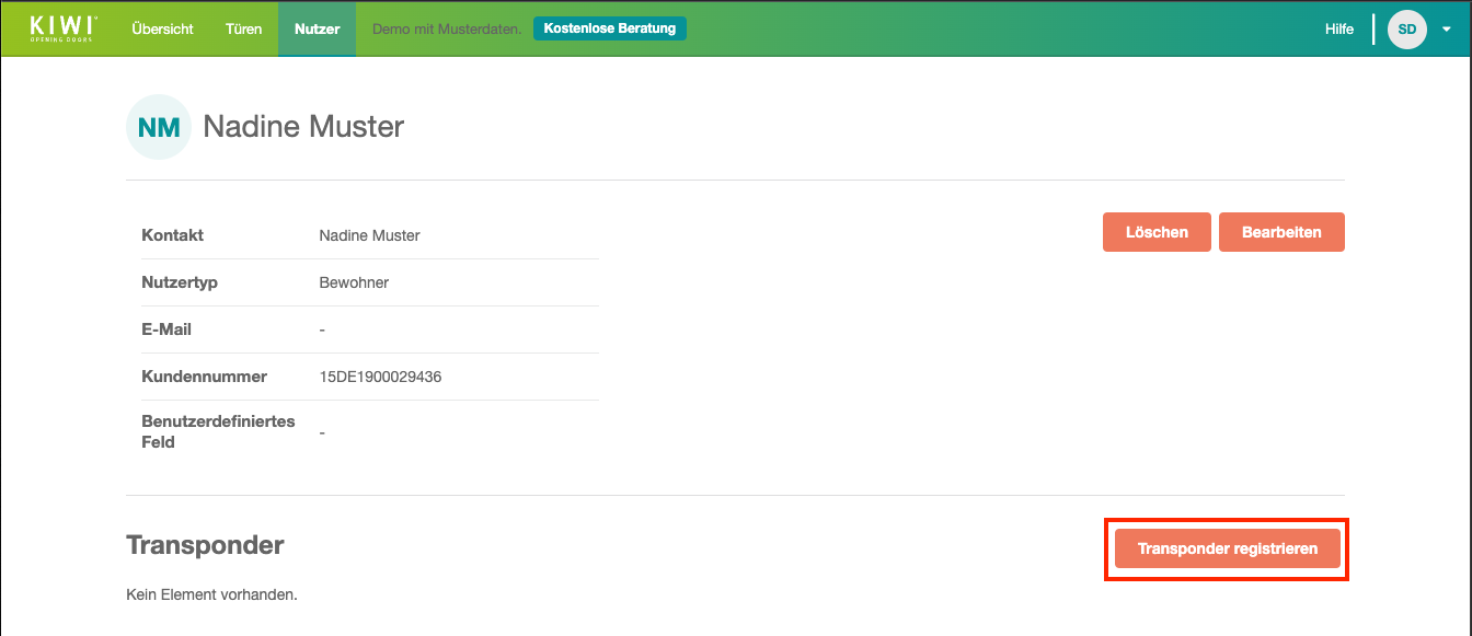 Es ist jedoch nicht möglich, für jeden Nutzer Transponder zu verwalten. App-Nutzer übernehmen die Verwaltung der Transponder selbständig. Sie erkennen einen App- oder Online-Nutzer an der hinterlegten E-Mail-Adresse und dem Etikett "Online-Nutzer" . Die Registrierung des KIWI Transponders erfolgt demnach von den jeweiligen Nutzern über die KIWI App. Eine ausführliche Anleitung der Transponder-Registrierung über die App finden Sie im Beitrag: Bedienungsanleitung App.