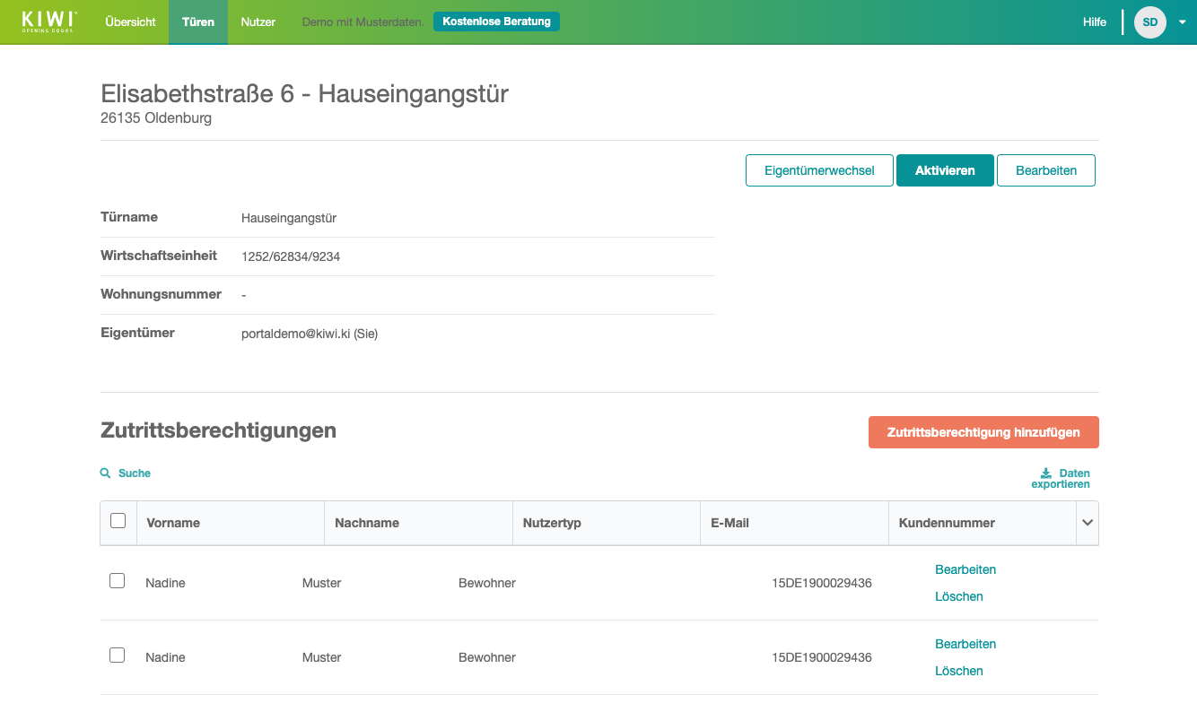 Über dem Menüpunkt „Türen“ rufen Sie eine Liste mit all Ihren Türen auf, die mit KIWI ausgestattet sind und zu denen Sie Berechtigungen haben, sowie alle Türen, die Ihrer Organisation angehören. Mit einem Klick auf die jeweilige Tür öffnet sich die Detailansicht, in der Berechtigungen und Informationen bearbeitet werden können.