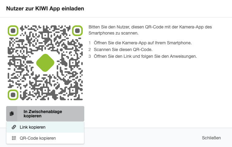 Sie können eine Einladung über einen QR-Code oder einen "Magic Link" erstellen. Dies ist insbesondere für das persönliche Onboarding vor Ort nützlich.